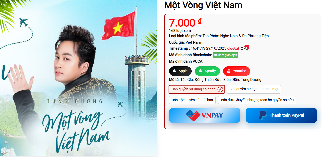 - Quan trọng nhất, mỗi tác phẩm đều được đính kèm Mã định danh Blockchain và có các tùy chọn mua bán rõ ràng cho bạn lựa chọn: Bản quyền sử dụng cá nhân, Bản quyền sử dụng thương mại, hoặc Bán đứt/Chuyển nhượng toàn bộ quyền sở hữu.